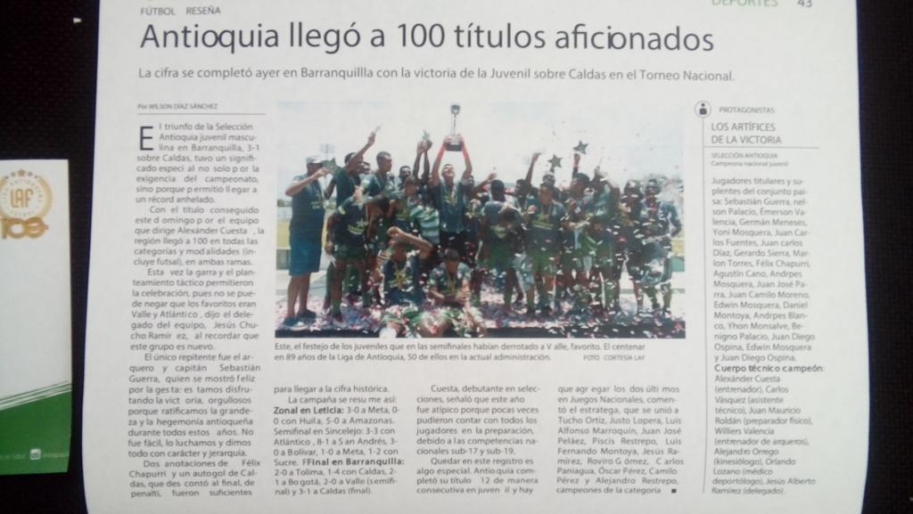 Los títulos obtenidos con Antioquia se resumen así: campeón con la Sub-17 de hombres en el 2.018 en Barranquilla, campeón del Torneo Nacional Sub-18 Medellín-2.019 y medalla dorada el mismo año con la “maicera” Infantil en Pereira, además, medalla de bronce en los Juegos Nacionales de Magangué (Bolívar) 2.019. Capítulo aparte merecen los logros obtenidos en el fútbol formativo, fue campeón del torneo de Asobdim 2.008, tercer puesto en las finales del Ponyfútbol 2.008, subcampeón de los Torneos departamentales LAF en las categorías: Sub-13 A (2.008 y 2.012) Sub-14 A (2.013) Primera C (2.107) y Sub 15 A (2.017).